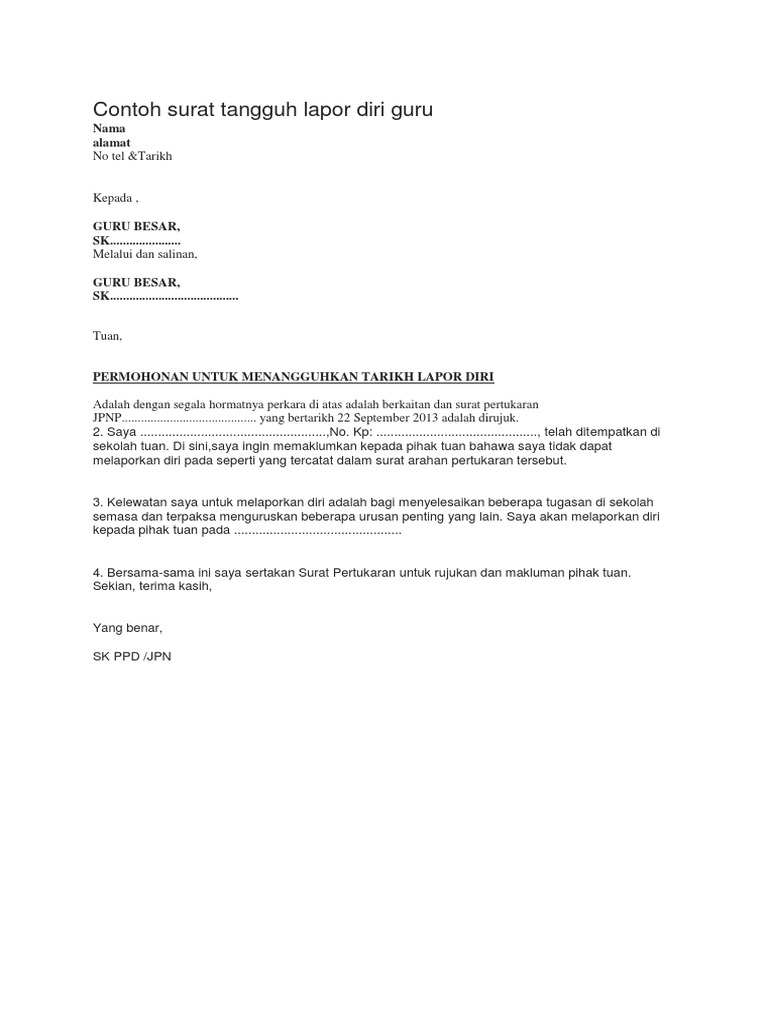 Cara Memohon Penangguhan Lapor Diri Bertugas. Contoh surat keterangan lapor diri kali ini admin postingkan contoh surat keterangan lapor diri silahkan simak di bawah ini. Hailmi SMK Luar Bandar No1 Sibu Km 334 Jalan Oya 96000 Sibu Sarawak Melalui dan salinan kepada Pengetua SMK Luar Bandar No1 Sibu Km 334 Jalan Oya 96000 Sibu Sarawak Pengetua SMK Jerlun KM 16 Jalan Putra 06150 Ayer Hitam Kedah 9 Januari 2015 Puan MAKLUMAN DAN PERMOHONAN.